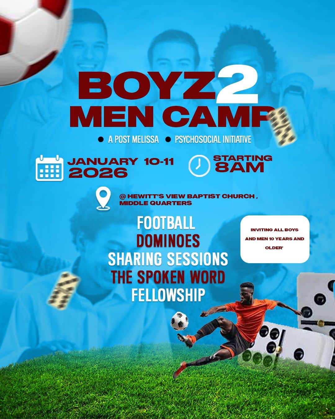 The National Men’s Ministry invites all boys and men 10 years and older to a “Post Melissa Psychosocial Initiative” at Hewitt’s View Baptist Church in St. Elizabeth. Join us for Football, Dominoes, the Spoken Word and Fellowship over two days.
