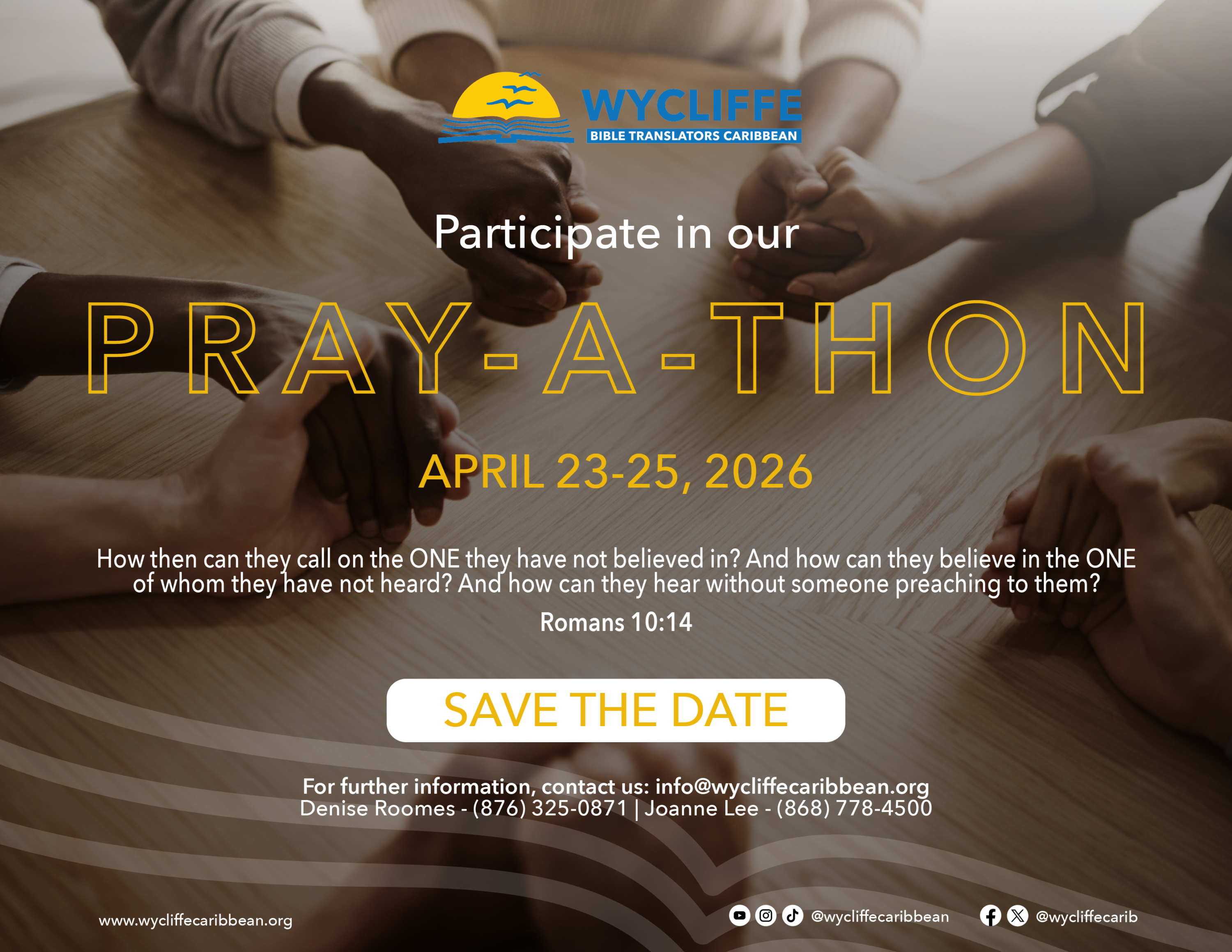 Wycliffe Caribbean will be having another 3-Day Pray-A-Thon, beginningonThursday, April 23, 2026, at 6:00 a.m. and ending at midnight on Saturday, April 25, 2026.