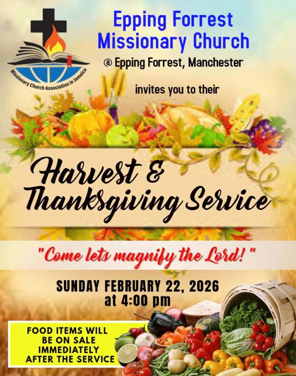 Epping Forrest Missionary Church’s Harvest and Thankgiving Service Feb 22 Epping Forrest Missionary Church’s Harvest and Thankgiving Service 4:00 PM - 6:30 PM