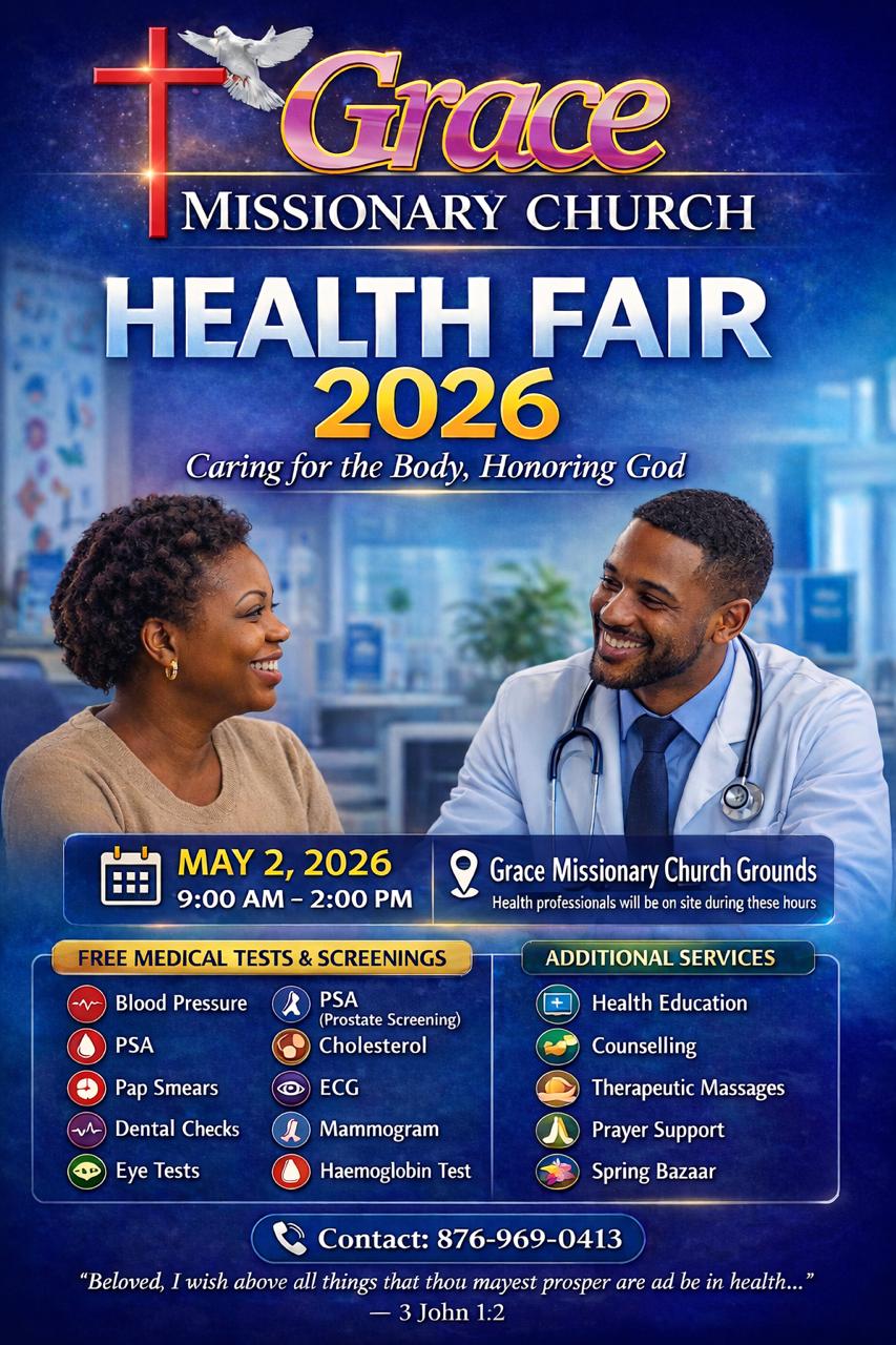 You are invited to join Grace Missionary Church for the Annual Health Fair on May 2, 2026. Numerous services available! See the attached flyer for more details.